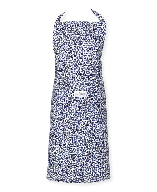 Die GreenGate Küchenschürze „Dahla white“ wird aus 100% Baumwollstoff mit einem zarten Muster in Blau und Weiß gefertigt. Sie kann im Nacken und in der Taille perfekt der Größe der Trägerin oder des Trägers angepasst werden.