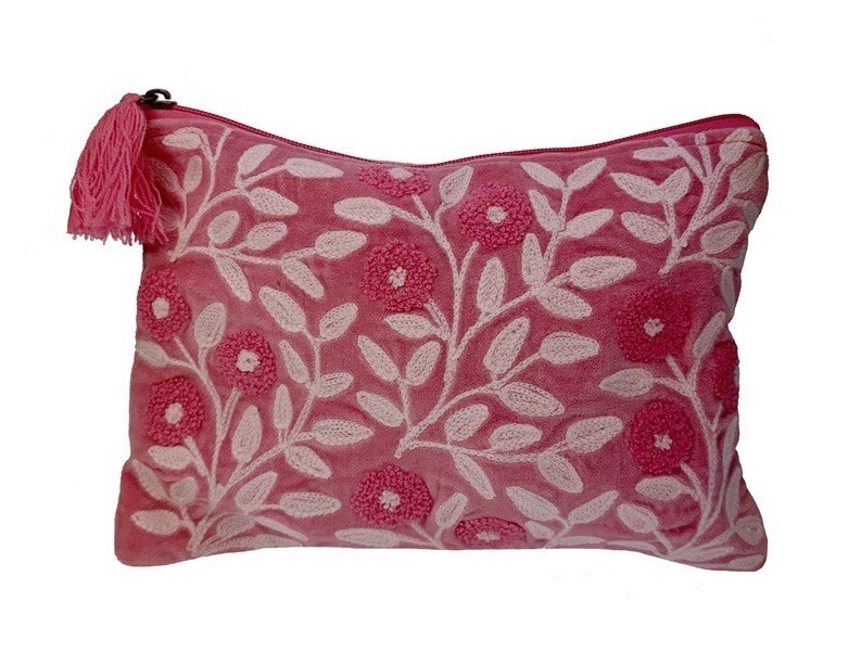 Die süße kleine Kosmetiktasche sorgt elegant für Ordnung in der Handtasche. Sie ist aus rosa Samt gefertigt und mit hellrosa und pinkfarbener Blüten und Blätter-Stickerei verziert. Verschliessbar mit einem  Reissverschluss, der mit einer kleinen rosa Quaste verziert ist.