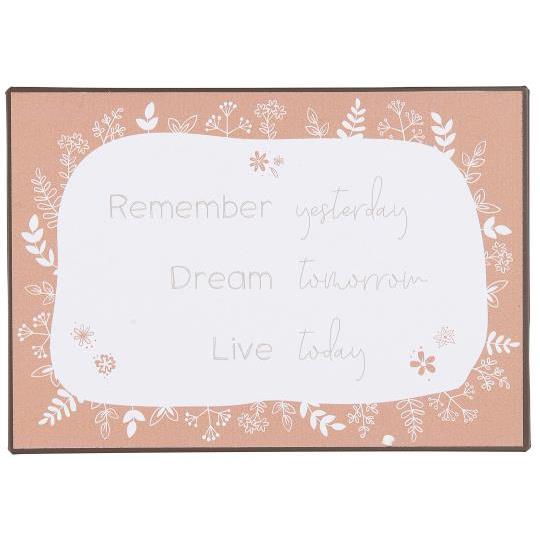 Verleihen Sie Ihrem Raum eine inspirierende und nostalgische Note mit diesem schönen Metallschild von Ib Laursen. Der Spruch „Remember yesterday, dream tomorrow, live today“ erinnert an die Wichtigkeit, den Moment zu genießen. Umrahmt von zarten Blumenmotiven, fügt es sich harmonisch in verschiedene Wohnstile ein. Mit den praktischen Metallanhängern lässt sich das Schild leicht an der Wand befestigen. Ein ideales Dekorationsstück für jedes Zuhause.