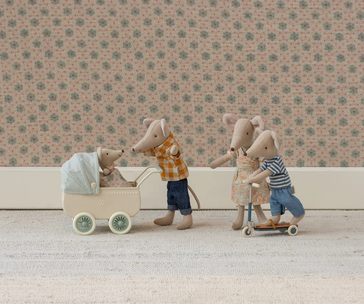 Der schöne Kinderwagen hat einen Vintage-Look und wird mit einer kleinen Maus im Schlafsack geliefert. Die Maus liegt auf einer weichen Matratze im Kinderwagen und schläft stundenlang.