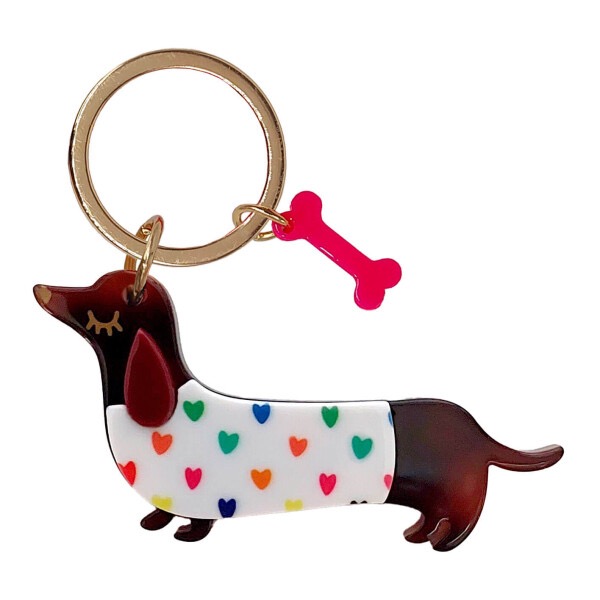 Der Anhänger ist in Form eines süßen Dackels 🙂 mit einem weißen Pullover mit bunten Herzchen. Am Schlüsselring befindet sich zusätzlich noch ein kleiner Knochen.