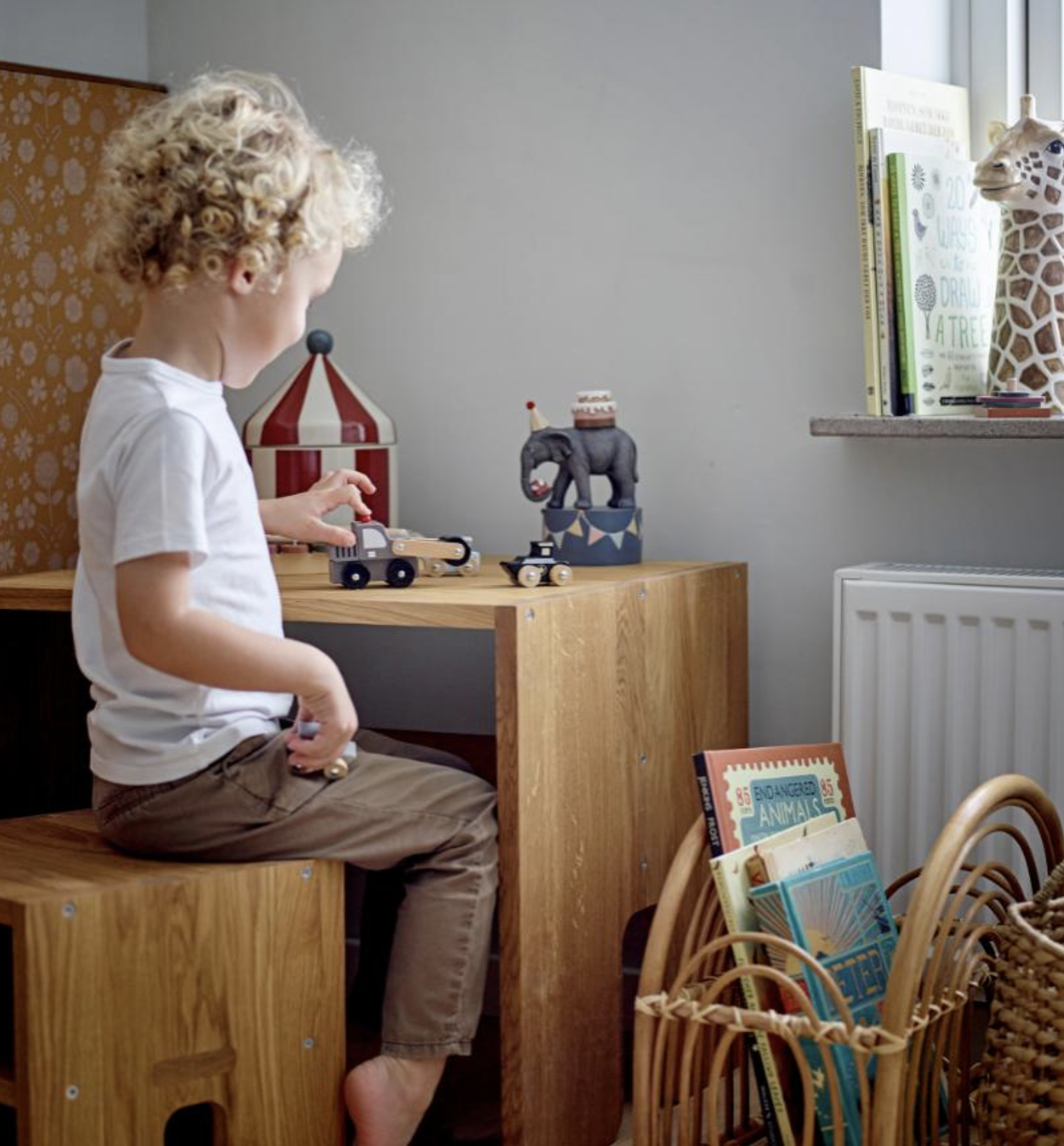 Die Spielzeugautos Ariston sind ein Set aus Feuerwehrauto, Helikopter und Walze aus Lotusholz in schönen Farben. Dieses Autoset regt Kinder dazu an, ihre Fantasie zu nutzen und zu entwickeln und ist außerdem sehr dekorativ auf einer Ablage.