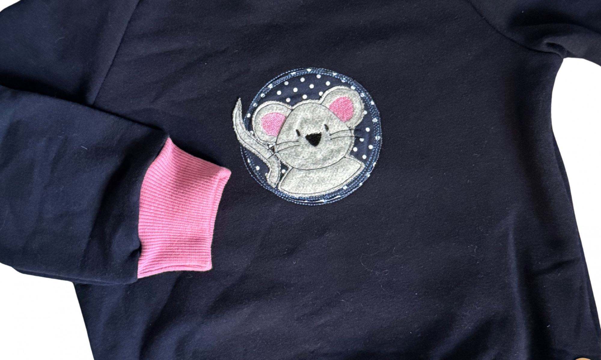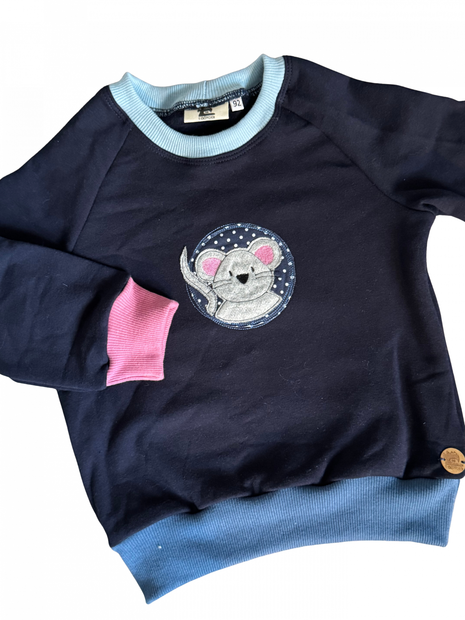 Dunkelblauer einfärbiger Baumwoll-Sweater im Raglanschnitt mit einem gestickten süßem Mausmotiv auf der Vorderseite. Das Rippbündchen der Ärmeln ist Pink, der Halsausschnitt Hellblau und der Pulloverabschluss ist Jeansblau. Mit viel Liebe handgemacht in Österreich.