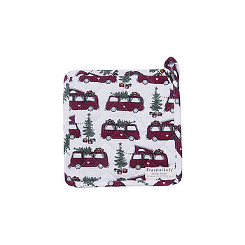 Der Topflappen „Christmas Camper“ bringt mit seinem charmanten Weihnachtsdesign festliche Stimmung in Ihre Küche. Perfekt zum sicheren Handling heißer Töpfe und Pfannen, kombiniert er Funktionalität mit einem einzigartigen, dekorativen Look.