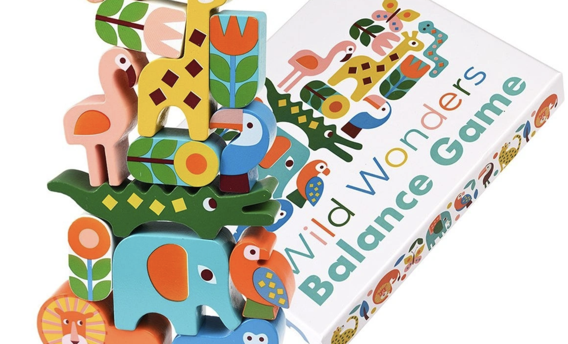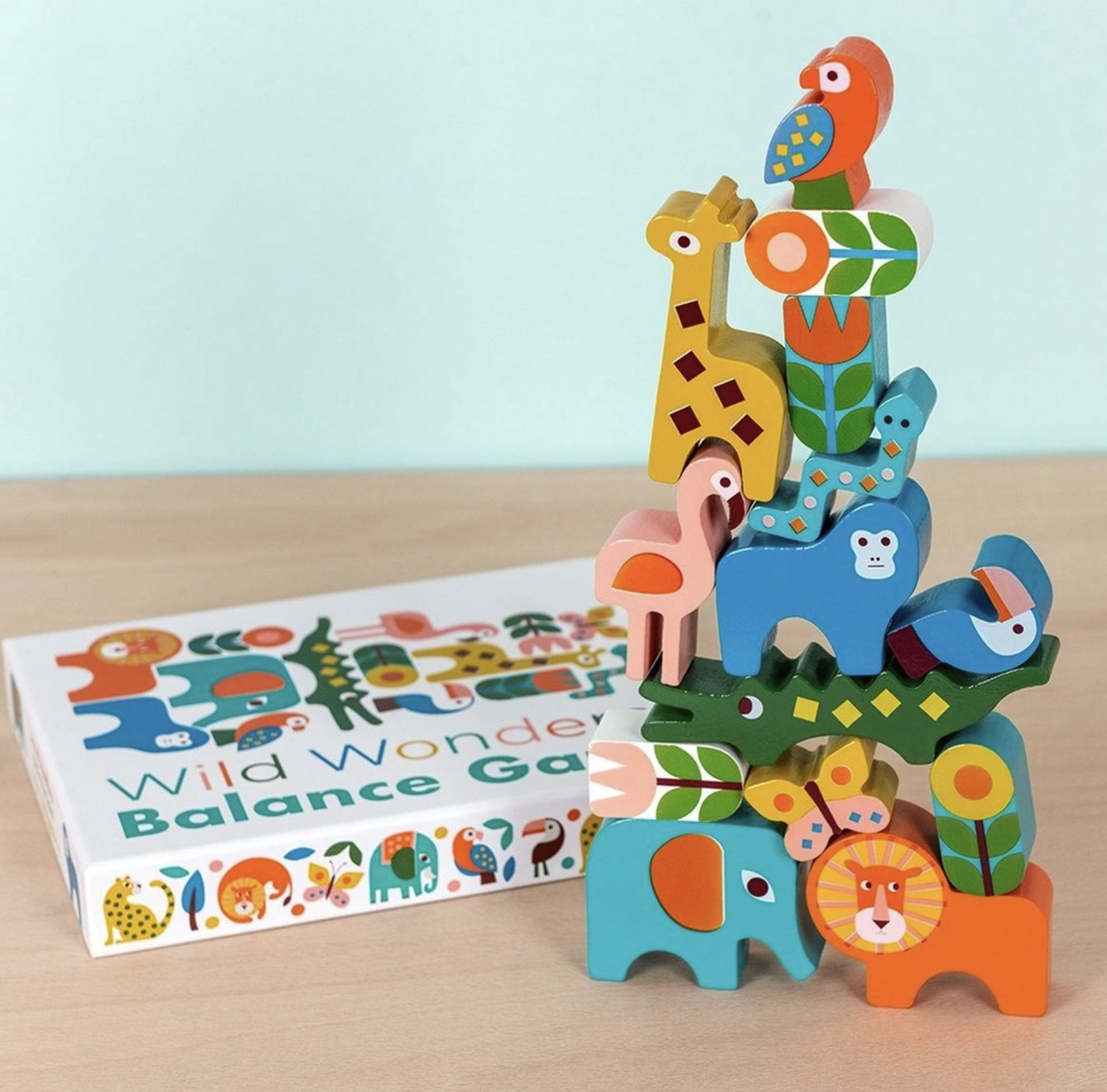Das Stapelspiel „Wild Wonders“ von Rex London besteht aus 14 Figuren. Die Blumen und Dschungeltiere sind kunterbunt und aus hochwertigem Holz. Kannst du die Tiere so aufeinander stapeln, dass der Turm nicht umfällt? Kennst du die Namen aller Tiere?